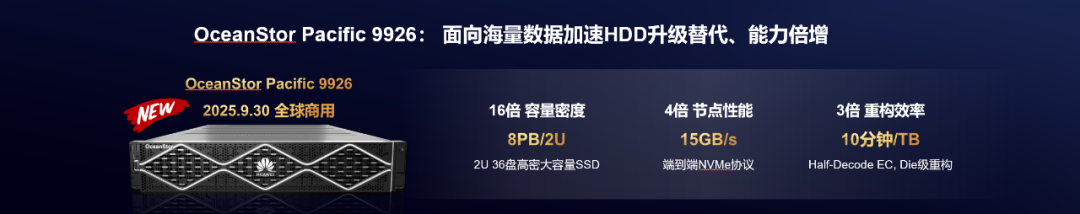 为了加速 SSD 在海量数据场景的规模应用,华为发布全闪分布式存储新品 OceanStor Pacific 9926,能力大幅提升,实现 1:1 升级替代 HDD。